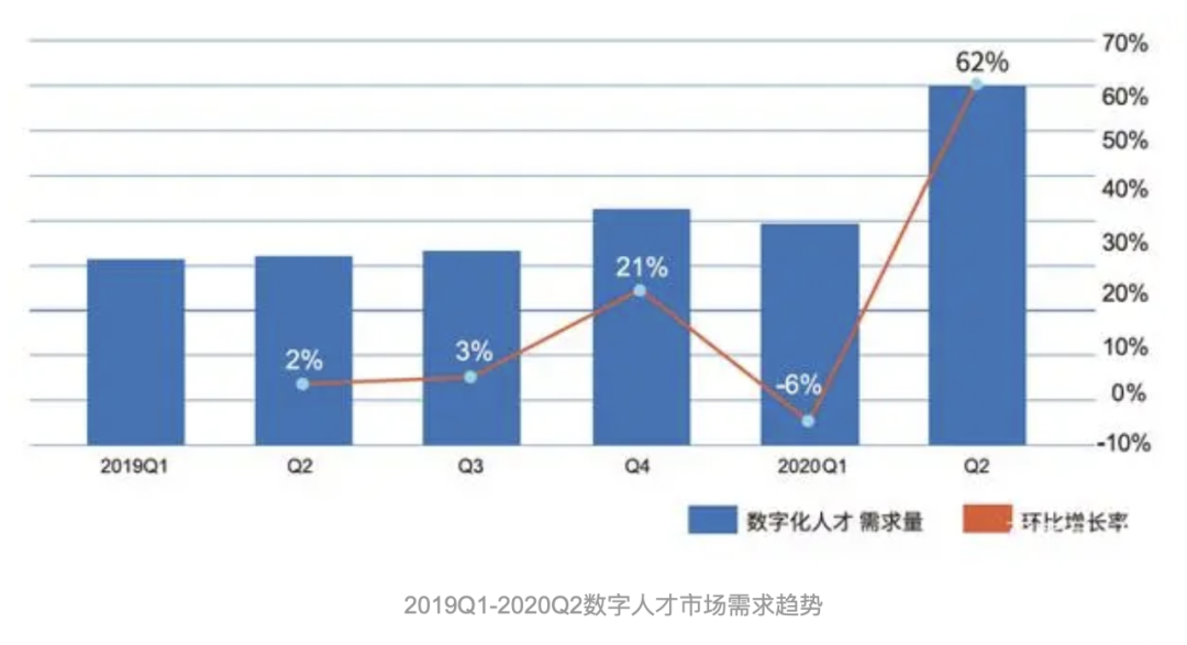 从某大型招聘平台分析数据我们可以看到,随着疫情对人们生活方式影响不断加深,数字化人才需求不减反增,并已成为企业招聘的重点。世界经济论坛曾估计,2025年科技与自动化将消灭8500万个原有工作岗位,创造9700万个新岗位。
