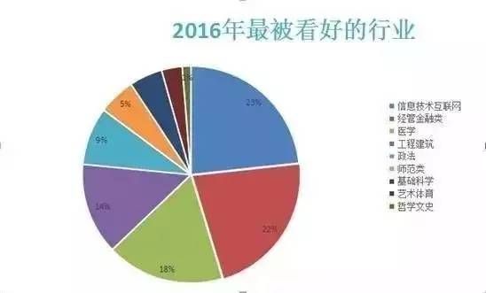 在样本调查过程中发现,在中国互联网行业崛起的大前提下,大家对信息技术互联网行业持看好态度,占比23%。2016年互联网行业成为当之无愧的就业形势最好的职业!