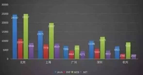 以北京上海广州深圳以及后起之秀杭州为例,分析近几年来Java,php,web前端以及.net工程师的就业趋势。虽然薪资有浮动变化,所有的职业都是呈上升趋势。这也就不难看出前面为什么互联网行业成为就业最被看好的职业了!