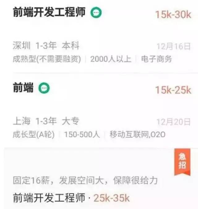 可以看到,即使是1-3年经验的前端工程师,薪资也高达10k,由于人才市场需求紧俏,甚至有企业开出了25K+16薪的薪酬,像这样的待遇,除了热门网游的高级原画师,普通的互联网职位是不容易企及的。
