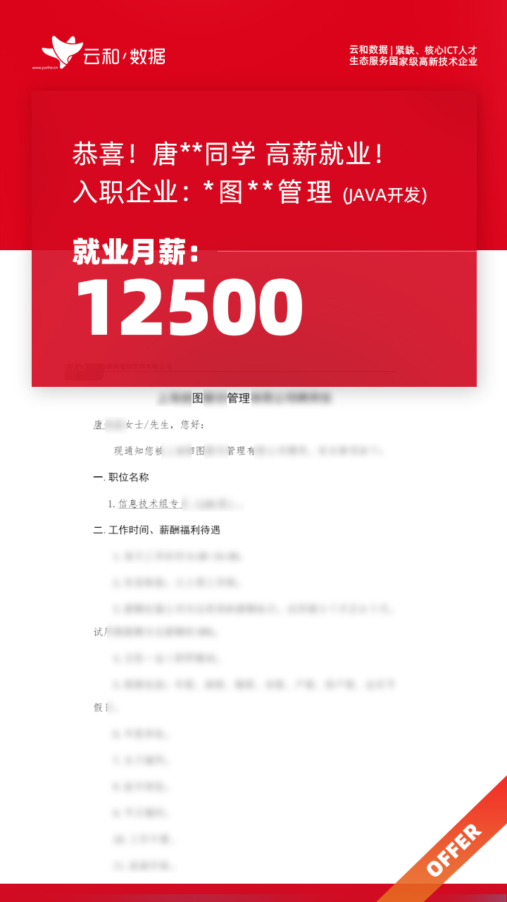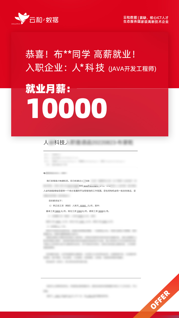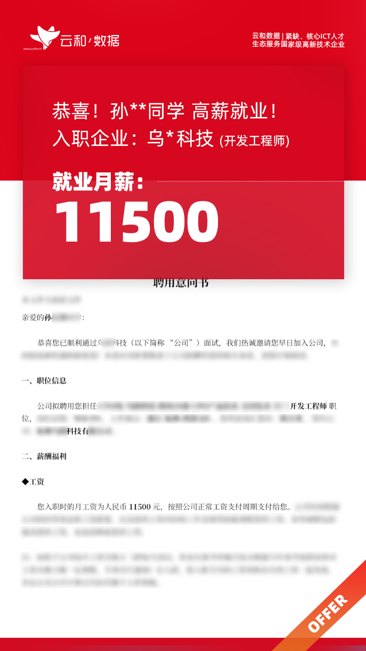 云和数据ICT职业教育发挥公司产业化优势与技术积淀,整合国内外优秀师资,累计自主研发140余项教辅、教材,115项实践教学实训平台,采用六位一体项目制教学模式,年培养高端ICT技术人才超10000人,其中线下ICT职业教育5500余人,累计为企业输送高端泛ICT技术人才超8万人,60%来自于口碑推荐。更大规模、更多人选择;更好的ICT学习、更好的就业。云和数据人才培养技术方向涵盖大数据、云计算、人工智能虚拟现实JAVA软件工程UI用户体验设计Web前端开发网络安全八大方向,云和数据以八大精品课程为基础,八大就业基地为依托,一次就业率99.02%,61.9%就业薪资超1W,以大数据为首的精品专业平均薪资13.25K。