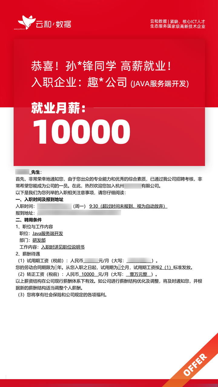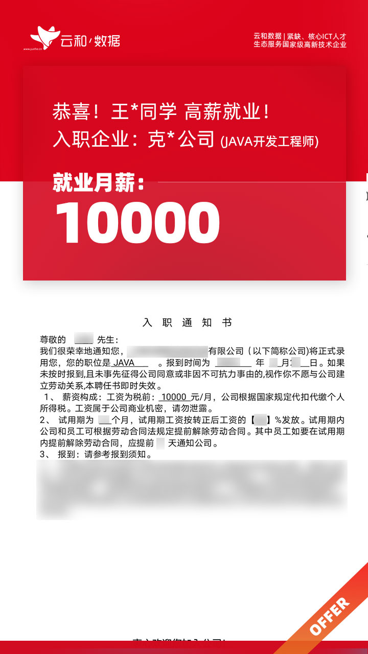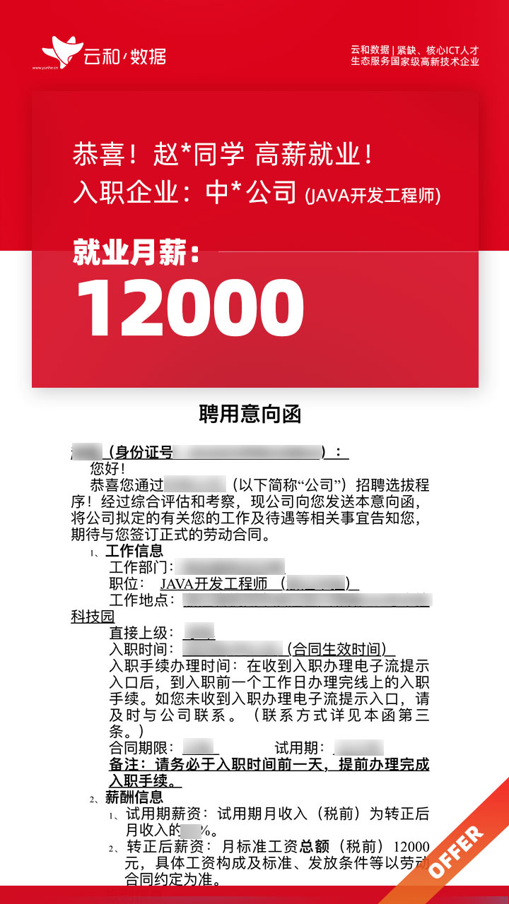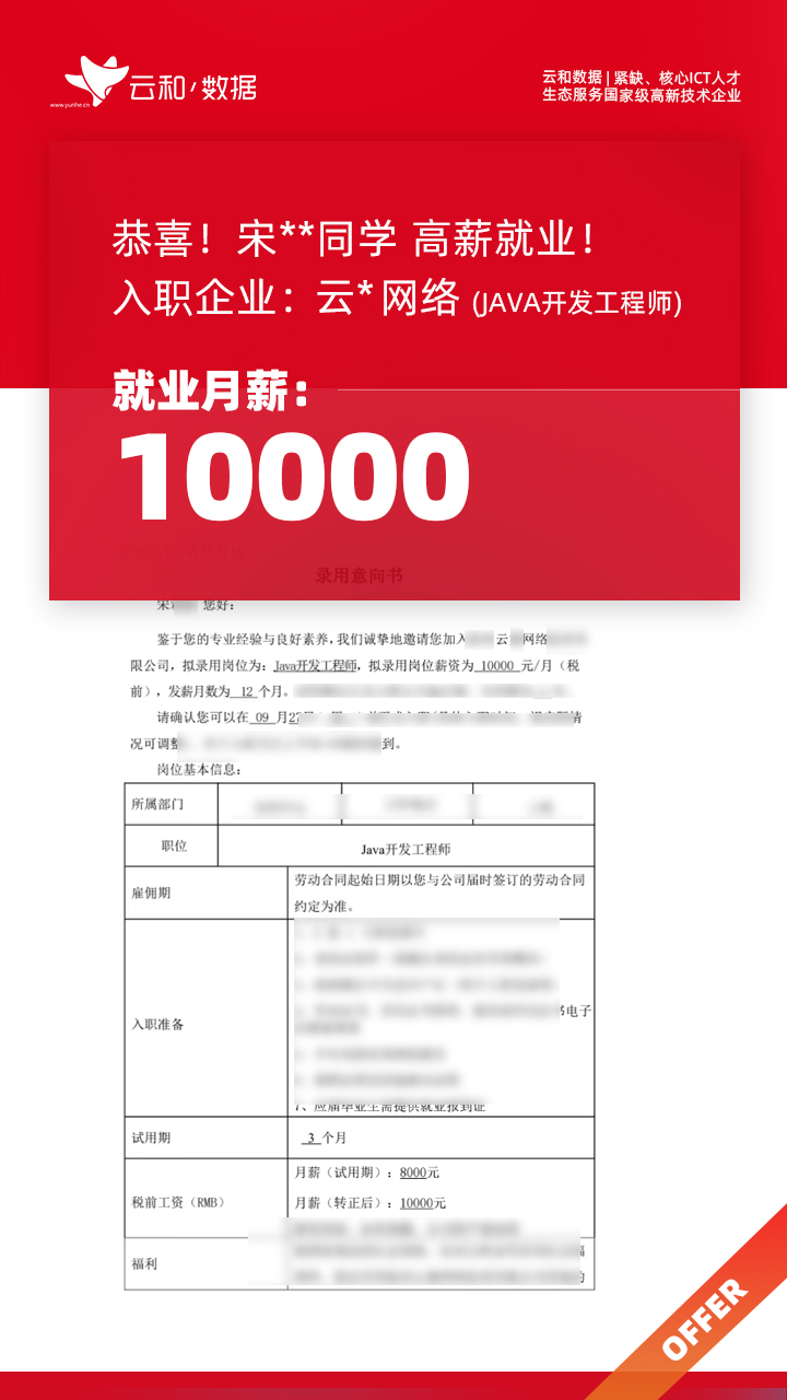 云和数据ICT职业教育发挥公司产业化优势与技术积淀,整合国内外优秀师资,累计自主研发140余项教辅、教材,115项实践教学实训平台,采用六位一体项目制教学模式,年培养高端ICT技术人才超10000人,其中线下ICT职业教育5500余人,累计为企业输送高端泛ICT技术人才超8万人,60%来自于口碑推荐。更大规模、更多人选择;更好的ICT学习、更好的就业。云和数据人才培养技术方向涵盖大数据、云计算、人工智能、虚拟现实、JAVA软件工程、UI用户体验设计、Web前端开发、网络安全八大方向,云和数据以八大精品课程为基础,八大就业基地为依托,一次就业率99.02%,61.9%就业薪资超1W,以大数据为首的精品专业平均薪资13.25K。