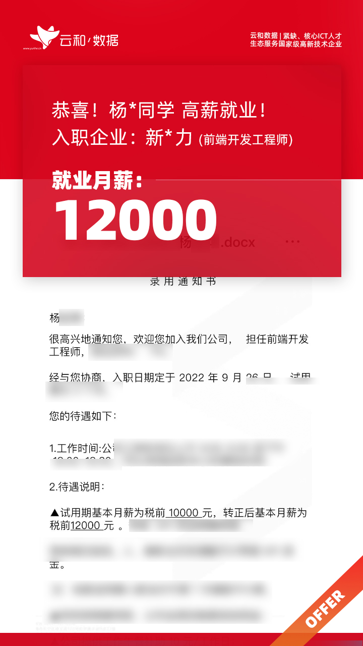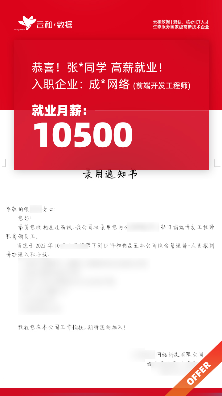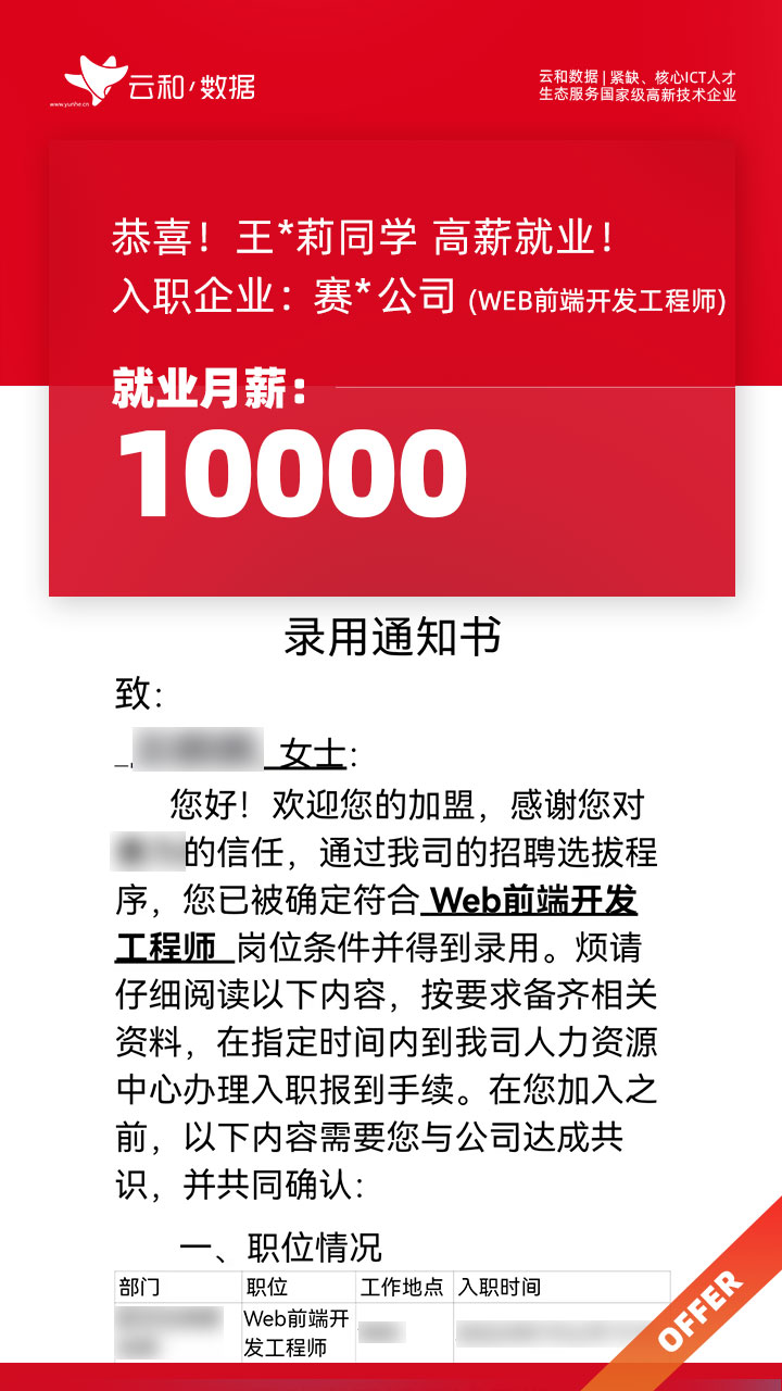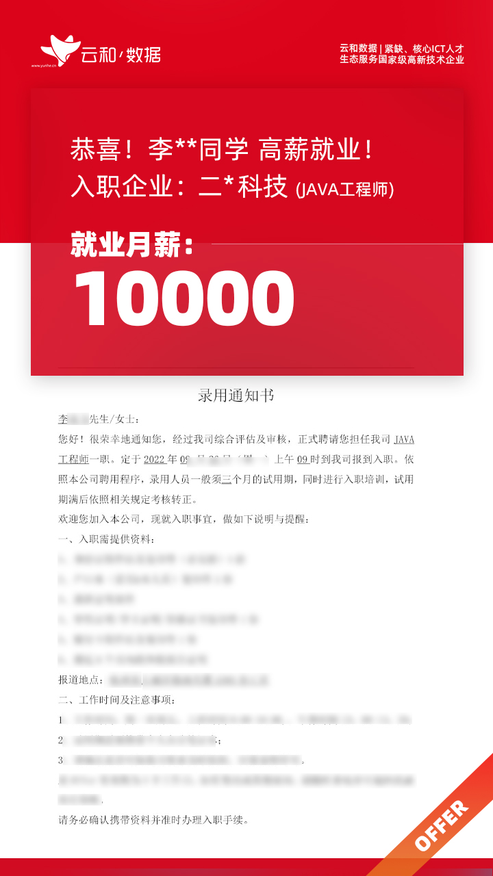 云和数据ICT职业教育发挥公司产业化优势与技术积淀,整合国内外优秀师资,累计自主研发140余项教辅、教材,115项实践教学实训平台,采用六位一体项目制教学模式,年培养高端ICT技术人才超10000人,其中线下ICT职业教育5500余人,累计为企业输送高端泛ICT技术人才超8万人,60%来自于口碑推荐。更大规模、更多人选择;更好的ICT学习、更好的就业。云和数据人才培养技术方向涵盖大数据、云计算、人工智能、虚拟现实、JAVA软件工程、UI用户体验设计、Web前端开发、网络安全八大方向,云和数据以八大精品课程为基础,八大就业基地为依托,一次就业率99.02%,61.9%就业薪资超1W,以大数据为首的精品专业平均薪资13.25K。