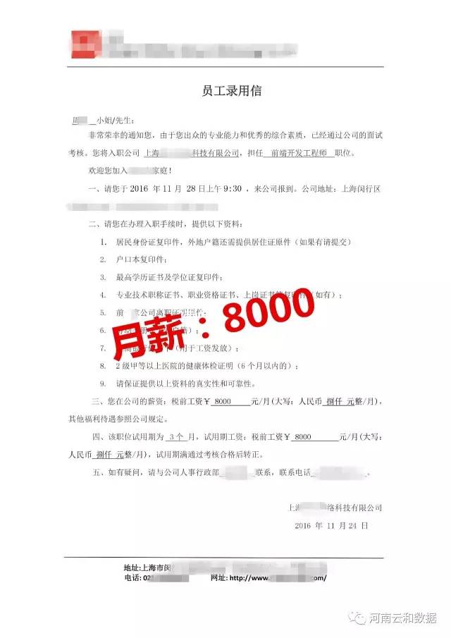 在云和的每一天都过的非常充实,从最初的懵懂无知,不知所措,到顺利通过第一个月的考核,他觉得自己更有信心了。反复的练习代码,请教老师和同学、练习项目、研究bug,学习成了他目前最大的兴趣,兴趣也是最好的老师。在这几个月时间里,周童鞋掌握了核心的技术,顺利通过每一阶段的测试,临近毕业,云和就业指导老师,还特意的培训了一下面试的各个环节注意事项,简历的制作、薪资谈判、技术测试等。还有很多云和合作企业直接上门招聘,他通过自己的努力,顺利拿到上海**网络科技有限公司月薪8K的offer,在公司担任前端开发工程师。