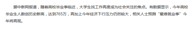 众高校准毕业生马上要进入实习求职阶段 要去哪个公司工作?如何顺利进入目标单位? 在谈论这个之前我们先看则新闻 可能你们已经看过新闻了 今年765万毕业生近半数未就业 也就是说还有380万应届毕业生在找工作 加上往届未就业毕业生 ...
