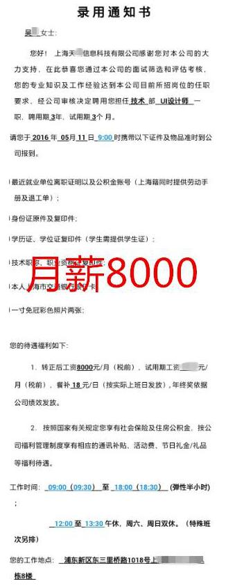 姓名:吴* 职位:UI设计师 目前薪资:8500元 就职公司:上海天*信息科技有限公司 毕业院校:开封大学 ui设计师录用通知书 时光匆匆,转瞬即逝,我完成了在云和教育的UI培训课程,正式入职新的工作岗位。四个月中,在云和教育老师的 ...
