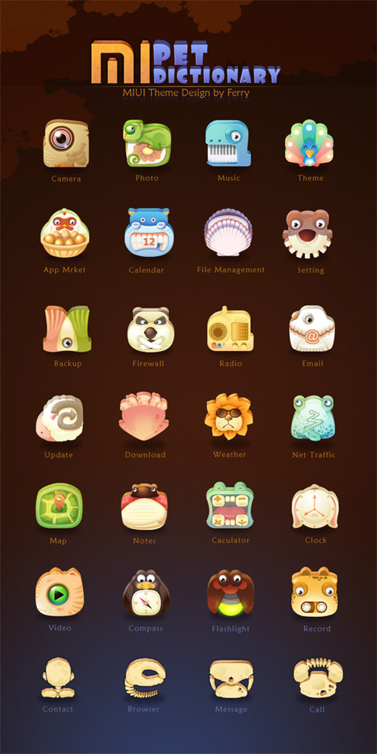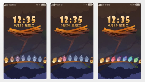 看图1和图2,有木有觉得特别有想象力和趣味性,将动物形象和产品功能结合得恰到好处,整体色彩把握也相当到位,活泼又不显得过于花哨,时钟widget也相得益彰,体现了作者扎实的色彩技巧和手绘功底。告诉你吧,图1和图2分别是MIUI第二届全球手机主题设计大赛中荣获二等奖的锁屏和图标设计,图一中解锁界面的灵感来源于多米诺骨牌,用手指拖动最左端小鹦鹉,就会出现一只撞击另一只的效果,撞击的时候蓝灰色的鸟会显示它原本的颜色,所有的鹦鹉连撞击直到最后的绿色鹦鹉将锁撞击出屏幕外即可达到解锁的效果,所有的鹦鹉撞击最终呈现的是彩虹色哦!