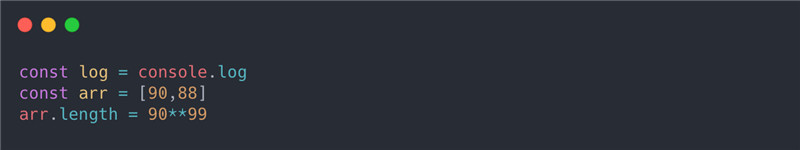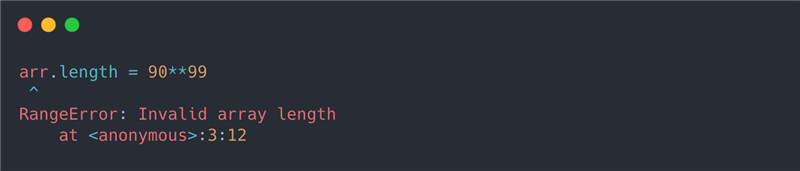 我们有一个数组,带有两个元素的arr。 接下来,我们尝试将数组扩展为包含90 ** 99 = 2.9512665430652753e + 193元素。
