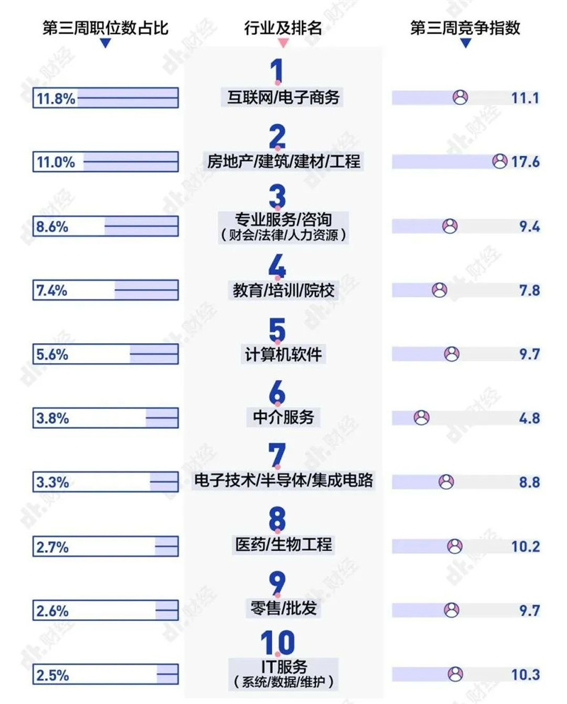 那么谁才是今年春招期间,职位多、竞争指数低的行业呢?从数据来看,中介服务、教育和电子技术/半导体/集成电路位列前三。