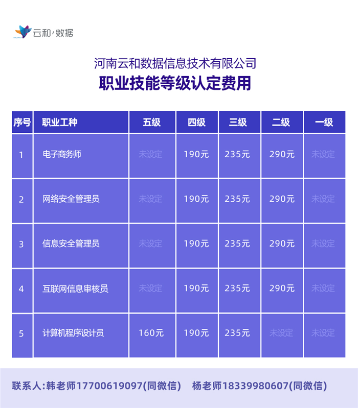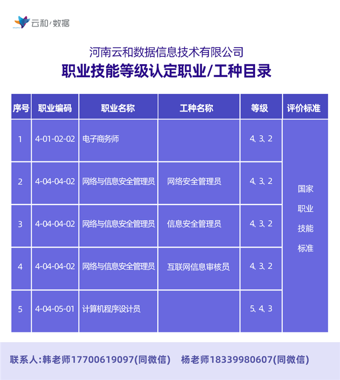 云和数据有电子商务师、网络与信息安全管理员和计算机程序设计员等工种的职业技能等级认定考试,有需要者可与老师联系咨询了解。