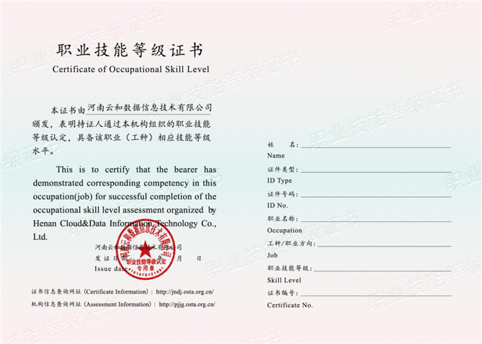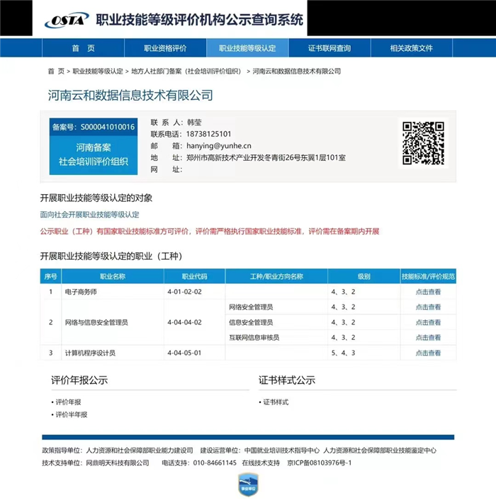 云和数据职业技能等级认定中心,经自主申报、专家遴选、信用核查、注册地人力资源和社会保障部门实地考核及征求社会各方面意见等程序,由河南省人社厅批准,人社部备案,成功入选2021年首批职业技能等级认定社会第三方评价机构名单,面向“电子商务师、计算机程序设计员、网络与信息安全管理员”三个职业(工种)开展评价工作。为确保实操技能考核环节的全流程电子化、信息化、智能化,全部过程可审核、可追溯、可监管,云和数据自主研发上线了Saas版《河南省郑州市职业技能等级认定一体化在线服务平台》,集报名、在线模拟测试、考生人脸识别座位抽取、实操线上考试、考务管理、在线评分、成绩复核等全流程一体化服务。其中考务管理可以实现考场分配、组建考评小组、自动组卷、生成准考证、导出上报等全流程云端操作。该平台可以为“人人持证 技能河南”等级认定评价机构一键部署多端口使用,极大提升了职业技能等级认定工作的效率。