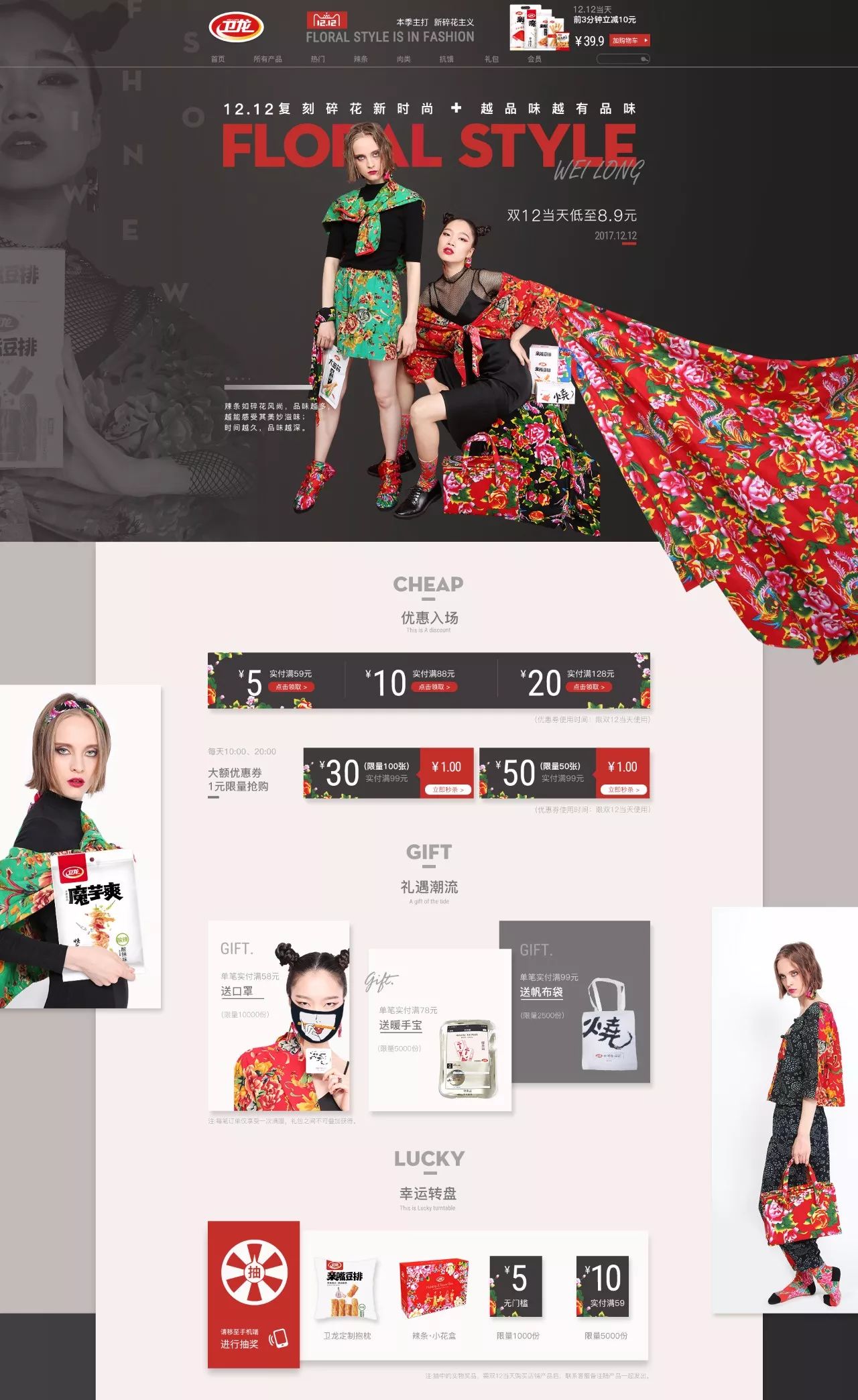 许久没出来搞事情的卫龙 还是在双十二惊艳出场了 这次卫龙走了一波“时尚风” 官网首先出现了红配绿城市非主流色 满屏幕的东北大花布面 蜜汁辣眼睛~ 模特夸张的妆容、厌食的表情 配上接地气的碎花床单、辣条 确实很敢玩,服! ...