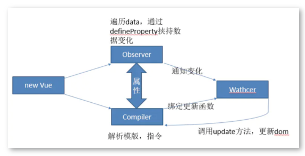 当我们 new Vue 的时候,会调用Observer,通过 Object.defineProperty 遍历 vue 对象的 data、computed 或者 props(如果是组件的话)的所有属性进行监听。同时通过Compiler解析模板指令,解析到属性后就 new 一个Watcher并绑定更新函数到 watcher 当中,Observer 和 Compiler 就通过属性来进行关联。