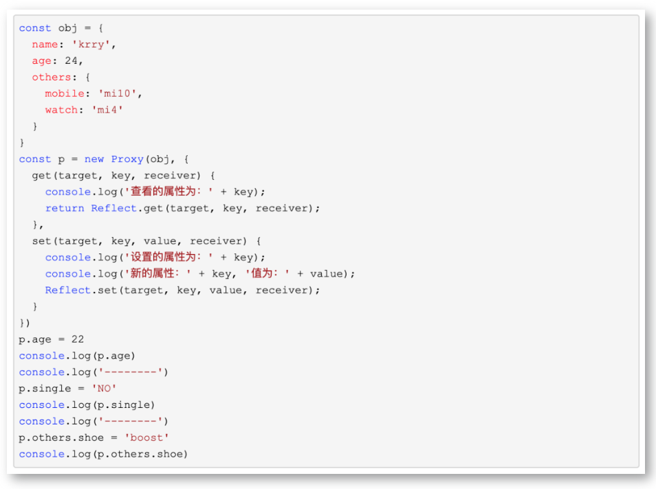 所以,不管是已有的 key 还是新增的 key,都会监听到。但是 Proxy 更加强大的地方还在于 Proxy 除了 get 和 set,还可以拦截更多的操作符,具体可看 MDN。
