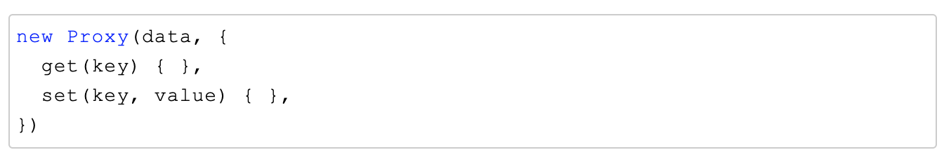 可以看到,proxy 不需要关心具体的 key,它去拦截的是 修改 data 上的任意 key 和 读取 data 上的任意 key。