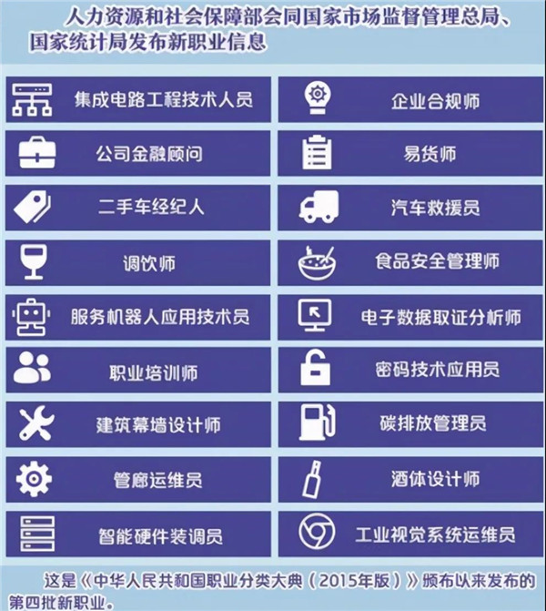 其中电子数据取证分析师、密码技术应用员、服务机器人应用技术员、智能硬件装调员、工业视觉系统运维员等新兴职业被国家认可,写入了《中华人民共和国职业分类大典》。