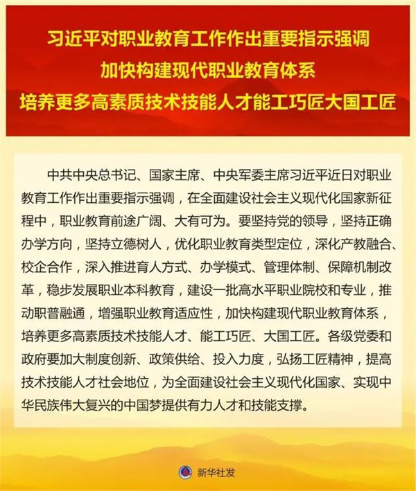 职业教育是培养技术技能人才的重要基础,在教育体系中的作用不可替代。各级党委和政府要深刻领会习近平总书记重要指示精神,加大制度创新、政策供给、投入力度,弘扬工匠精神,培养更多高素质技术技能人才、能工巧匠、大国工匠,推动职业教育提质培优,提高技术技能人才社会地位,把“大有可为”的殷切期盼转化为“大有作为”的生动实践,为全面建设社会主义现代化国家、实现中华民族伟大复兴的中国梦提供有力人才和技能支撑!
