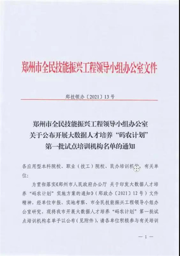 6月28日下午,郑州市全民技能振兴工程领导小组办公室颁发文件,文件中提到:为贯彻落实《郑州市人民政府办公厅 关于印发大数据人才培养“码农计划”实施方案的通知》(郑政办[2021]12号)文件精神,经单位申报、实地考察、市全民技能振兴工程领导小组办公室研究,现将我市开展大数据人才培养“码农计划”第一批试点培训机构名单予以公布。这其中有应用型本科院校、职业(技工)院校与培训机构,经过郑州市政府“码农计划”调研小组的严格把关、层层审核,最终在百余所机构中臻选出有资质、有能力承接的共15所。云和数据作为规模更大、更具影响力的紧缺、核心ICT人才生态服务国家级高新技术企业,位列其中。(详情文件见下图)