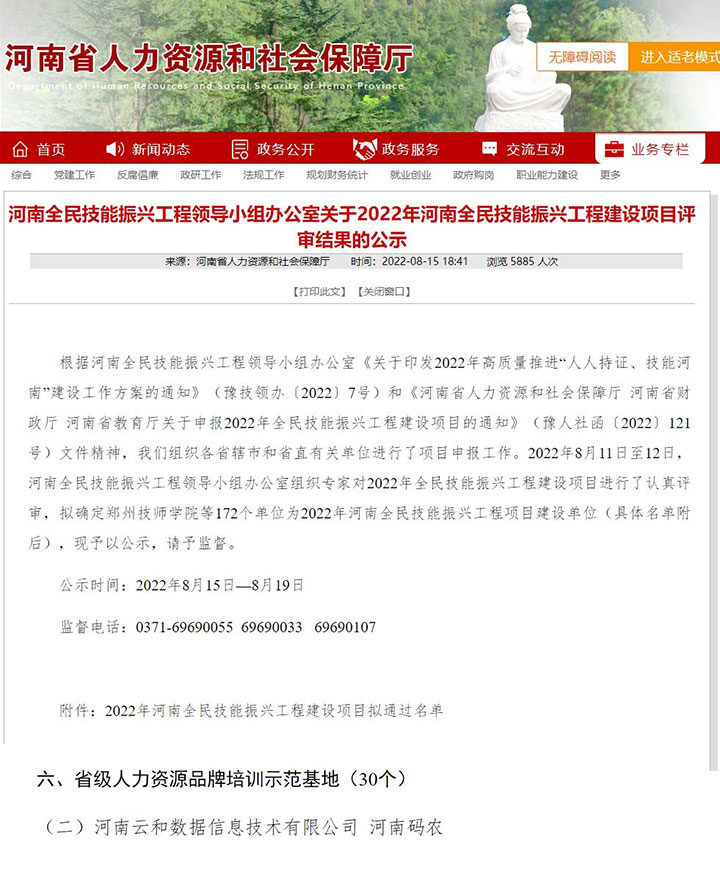 2022年8月15日,河南省人力资源和社会保障厅官网公示2022年河南全民技能振兴工程建设项目评审结果,河南云和数据信息技术有限公司“河南码农(数字技能)”成功入选省级人力资源品牌培训示范基地名单。