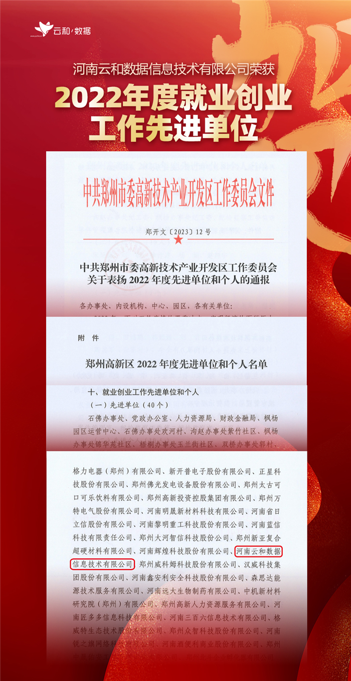 2023年1月15日,中共郑州市委高新技术产业开发区工作委员会发布《关于表扬2022年度先进单位和个人的通报》,对云和数据等40家企事业单位在2022年度就业创业工作中的先进表现进行通报表扬。