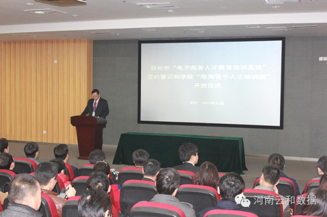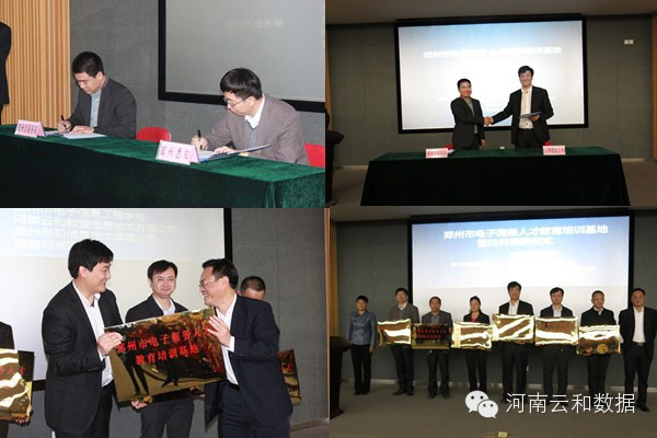 2014年11月26日上午,6家院校企业同郑州市商务局在河南省电子商务产业园正式签约,合作共建电子商务人才教育培训基地,并举行了电商骨干人才培训班开班第一课。河南省商务厅电子商务办公室副主任韩玉舟、郑州市投资促进服务中心主任张延廷出席,各县(市区)商务局、开设有电子商务专业的高校、省级示范企业100多人参加