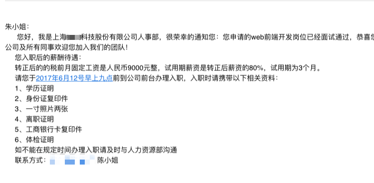 朱同学,云和数据HTML5专家班的一名学员,毕业即入职上海某科技股份有限公司,担任web前端开发工程师一职,月薪9000。