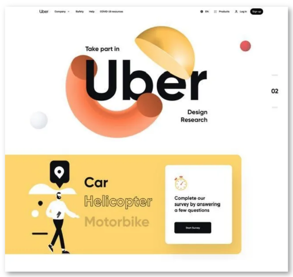 将二维世界三维化,将是2021年设计中非常重要的一个趋势。比如:uber的概念官网就通过3D来呈现,表达功能亮点。。设计师去探索更多维度学科与UI界面融合,形成一种全新的视觉感官。