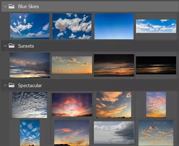 内置的天空素材多达三类16种「蓝天」、「晚霞」「壮丽」基本涵盖摄影爱好者日常所需