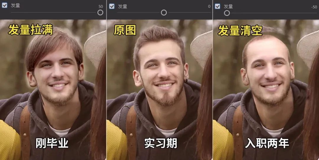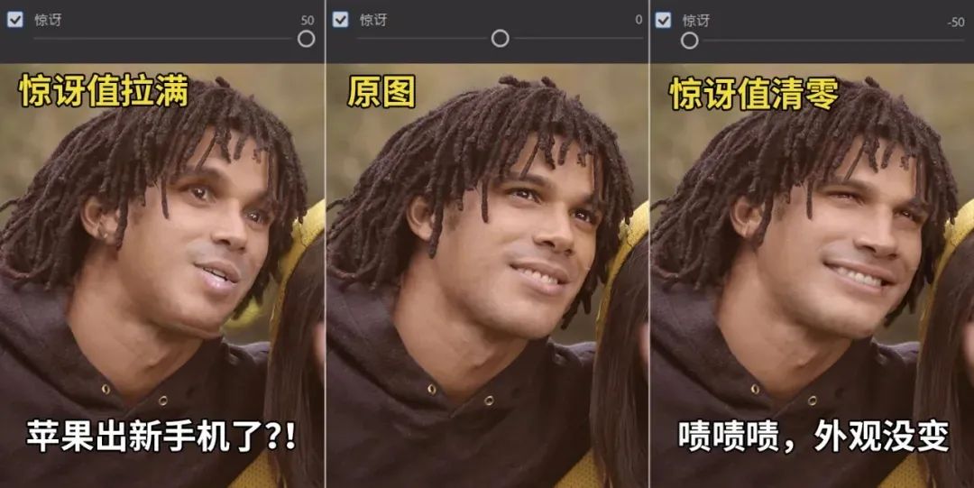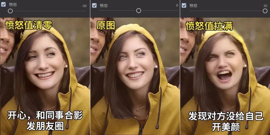 只要将开心值、惊讶值、愤怒值细心调整,组合使用足以让照片人物的表情千变万化